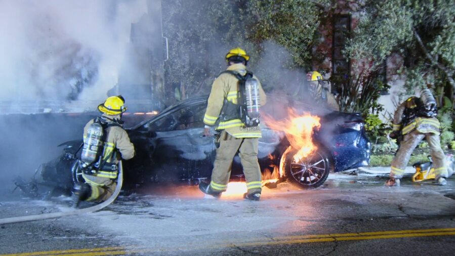 BREAKING: A woman is recovering after a dramatic rescue by two good Samaritans who pulled her from a burning car in Los Angeles’ Beverly Grove neighborhood early this morning. The incident unfolded around 2:30 AM as the blue Toyota Camry crashed into the back of a truck before erupting into flames, trapping the woman inside.