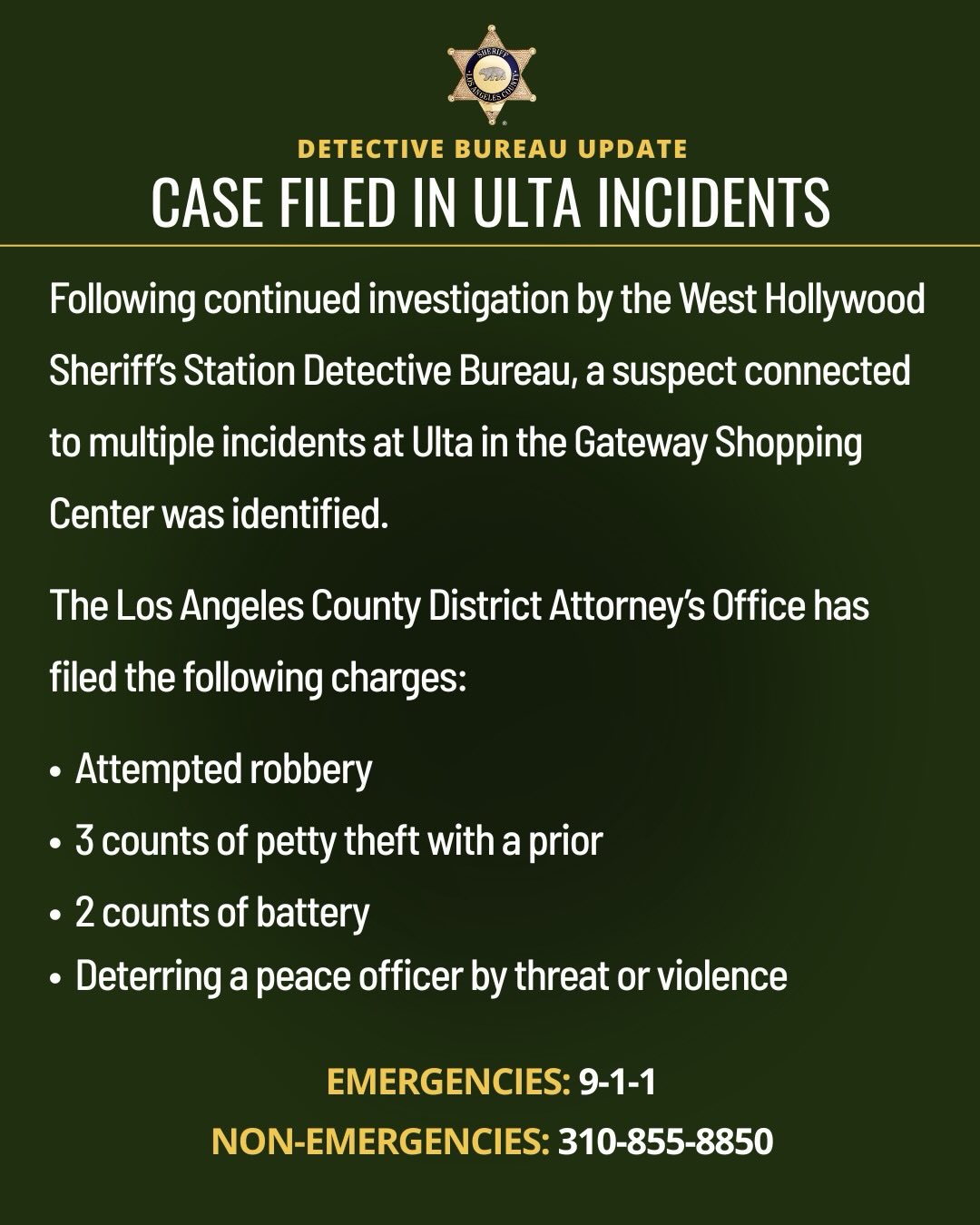 BREAKING: A suspect has been arrested and charged with multiple counts of shoplifting from Ulta Beauty in the West Hollywood Gateway shopping center, according to the West Hollywood Sheriff’s Station. The arrest occurred on March 14, following an investigation by the station’s Detective Bureau.
